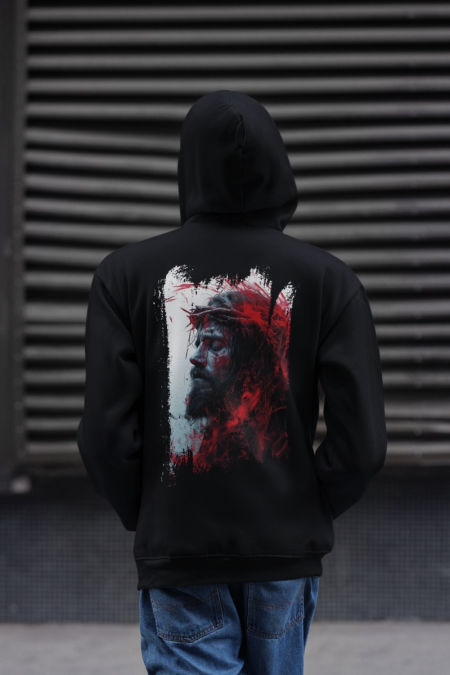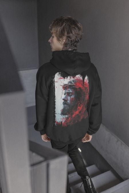 Bluza z serii – Oblicze to kolekcja odzieży z wizerunkiem Oblicza Chrystusa w różnych odsłonach na białym, czerwonym i niebieskim tle .