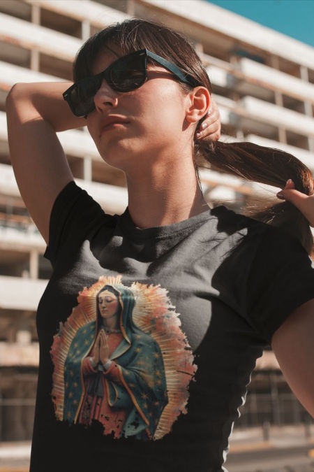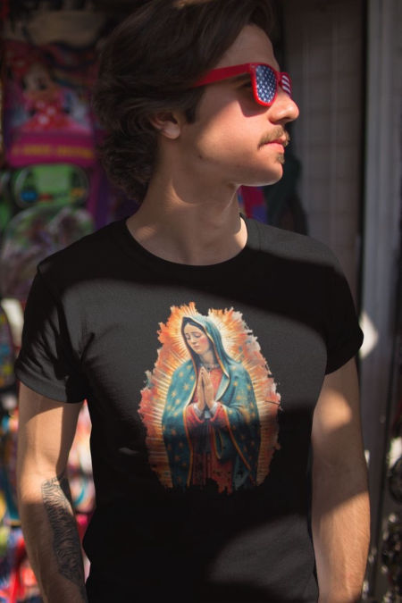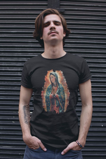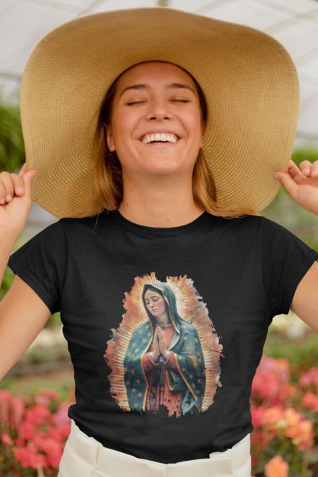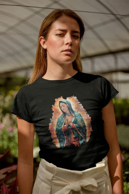 Koszulka – Matka Boża Guadalupe. Koszulka z serii – Wizerunek. Koszulka w klasycznym kolorze białym i czarnym.