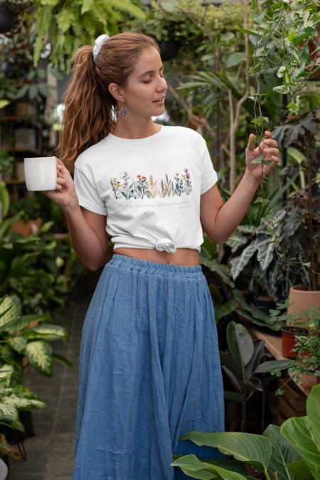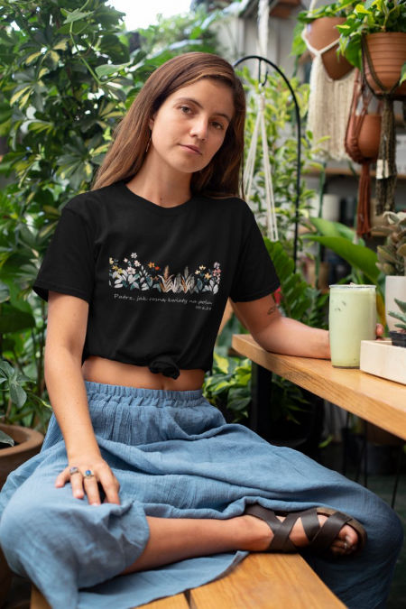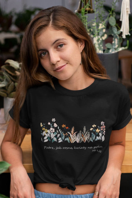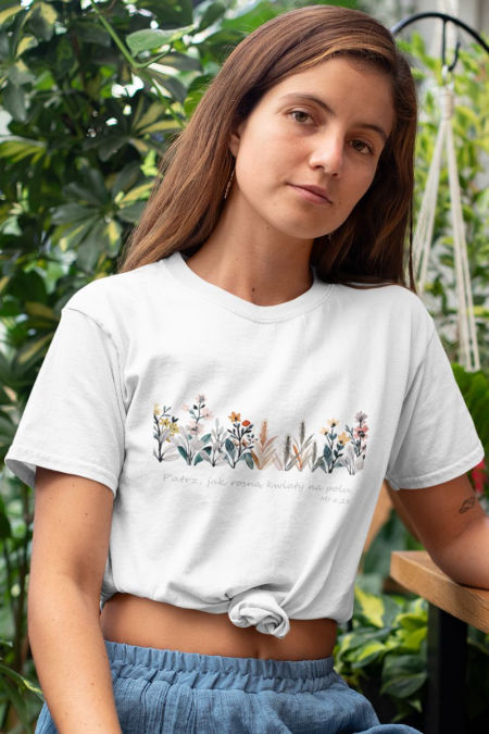 Koszulka – Kwiaty polne . Koszulka z serii – Duma . Koszulka w klasycznym kolorze białym i czarnym i klasycznym kroju