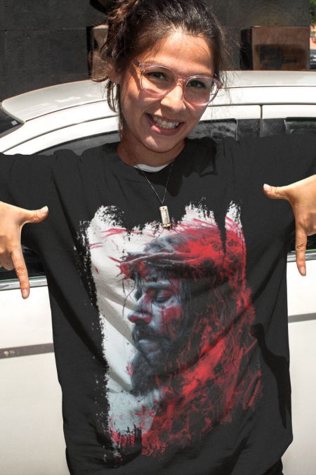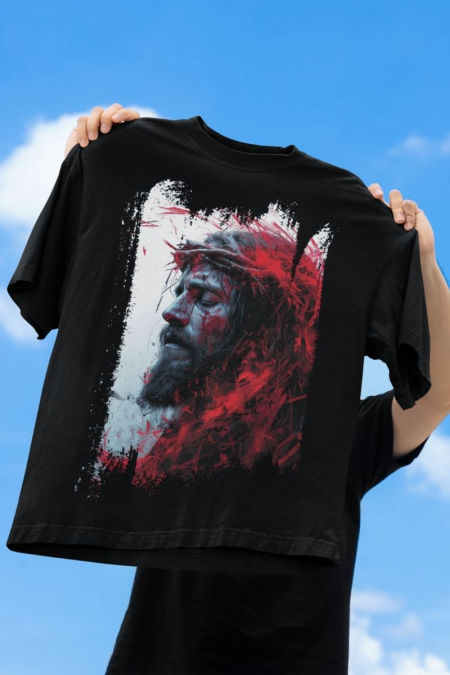 Koszulka z serii – Oblicze to kolekcja odzieży z wizerunkiem Oblicza Chrystusa w różnych odsłonach na białym, czerwonym i niebieskim tle .