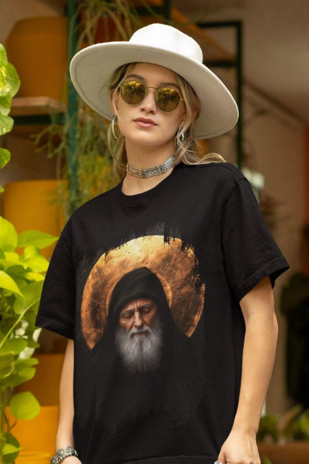 Koszulka – św. Szarbel. Koszulka z serii – Wizerunek. Koszulka w klasycznym kolorze czarnym i powiększonych rozmiarach